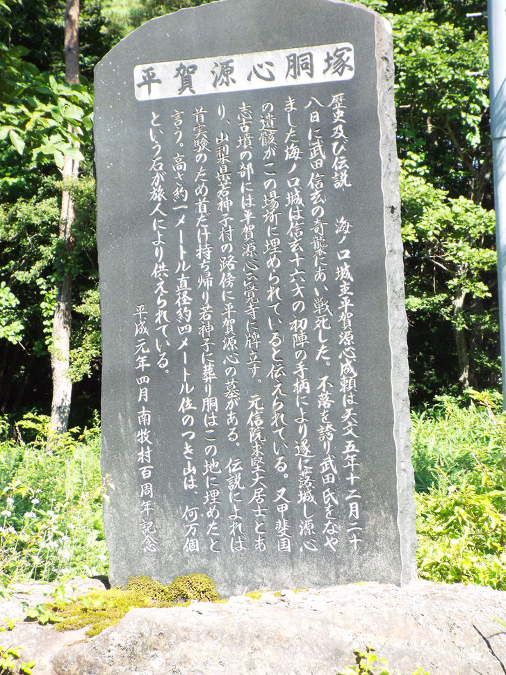 『海ノ口城城主』で在った『平賀源心成頼』は『武田信玄の信濃攻め』に於いて落城、『首実検』の為に甲府に運ばれる途中でしたが、此の地で首を落とされ、胴体のみ此の地に埋められたそうです。戦国時代では、確実に倒したかを確認する為『敗将』の首を持ち帰り、顔を知る者に確認させたそうです。その為『首だけ』を埋めた『首塚』と『胴体』を埋めた『胴塚』が別々の場所に在るのが普通です。
