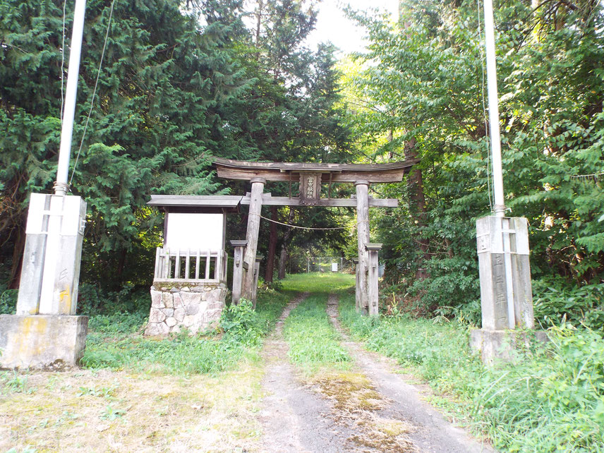 道路を進んでいくと一の鳥居が在ります。車の轍が続いてますので一礼して鳥居を潜ります。