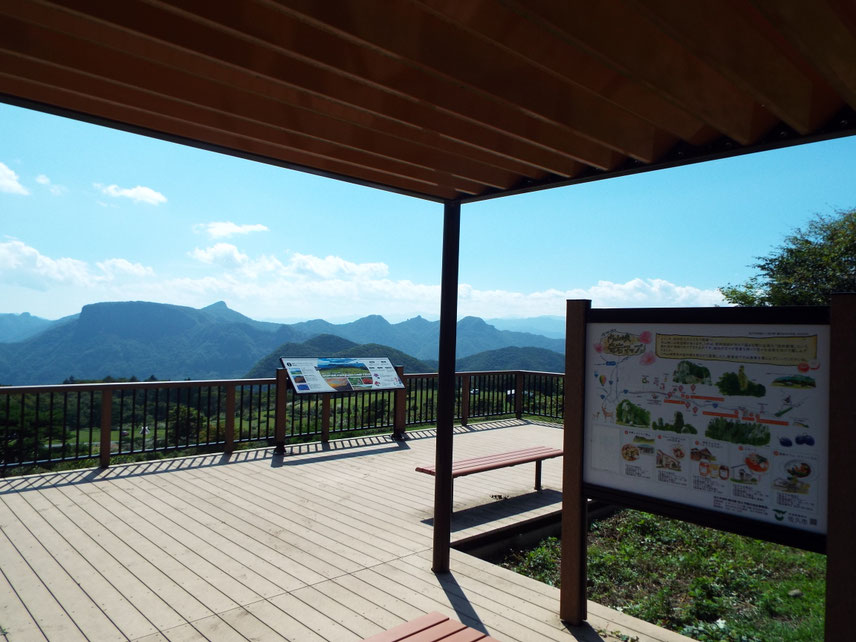 テラスの向こうに見える『テーブルマウンテン』みたいな山が『荒船山』です。